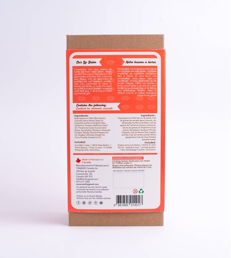 Ingredients: Butyrospermum Parkii (Shea Butter) Fruit, Cannabis Sativa (Hemp) Seed Oil, Euphorbia Cerifera (Candelilla) Wax, Carthamus Tinctorius (Safflower) Seed Oil, Theobroma Cacao (Cocoa) Seed Butter, Ascophyllum Nodosum, Mentha Piperita (Peppermint) Oil, Zingiber Officinale (Ginger) Oil, Citrus Paradisi (Grapefruit) Oil. Included: 8 Lip Balm Tubes, (30ml) Glass Beaker, Wood Spatula, Drop Counter, 1 Furoshiki Wrapping Cloth, Instructions.