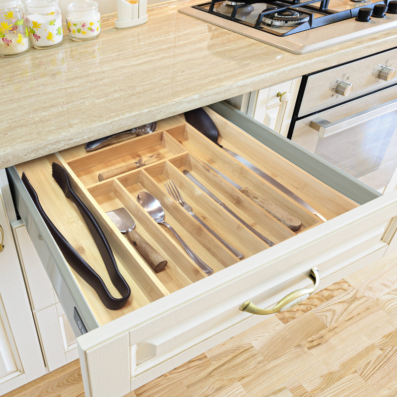 100% PURE BAMBOO Imagine Chef adjustable bamboo kitchen drawer organizer is made of 100% bamboo; There is absolutely no MDF or other materials in our premium cutlery organizer