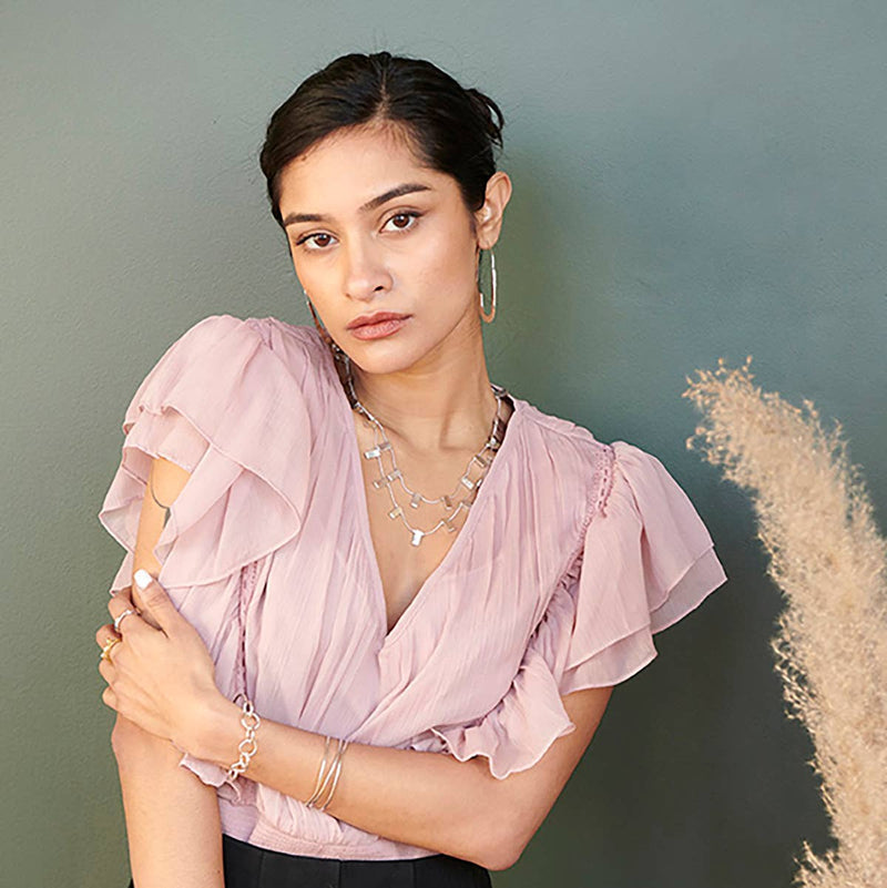 Seven small circles are interlinked to create a solid chain across the top of this matte gold cuff.