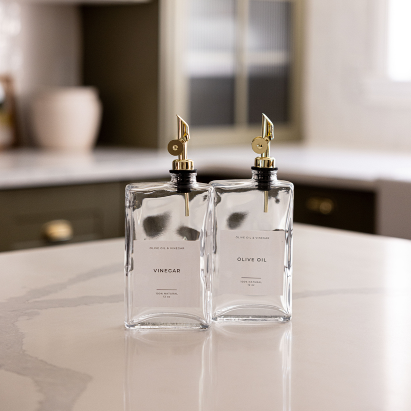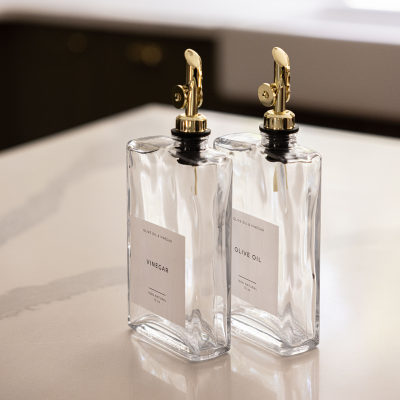 The Luxe B Co Rectangle Olive Oil & Vinegar Dispenser Bottles are a great way to elevate your kitchen. These bottles feature a sleek label and a stainless steel pour spout. The Rectangle Olive Oil & Vinegar Dispenser Bottles are an easy way to add functional and stylish ways to add to your kitchen decor.