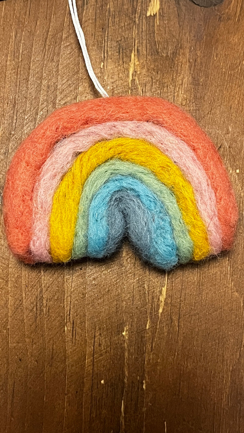 This plush Large Pompom Rainbow makes an adorable addition to nurseries and children's rooms alike. Crafted out of wool felt and styro, the soft texture of this bright plush rainbow accented with two fluffy white clouds is the perfect decorative accessory to help little imaginations soar! Also available in a smaller