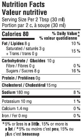 Misc Uses: Hints of toasted cream, a light touch of salt, with the smooth finish of Canadian whisky. Drizzle on waffles, ice cream, fresh fruit, fruit crisps and pies, chocolate cake, brownies, and lattes.