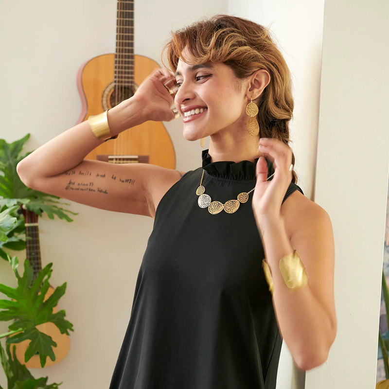 Five leaf-shaped medallions are embellished with a cutout abstract pattern decor and linked together to create a lightweight, statement-making necklace. It has a satiny-matte finish.