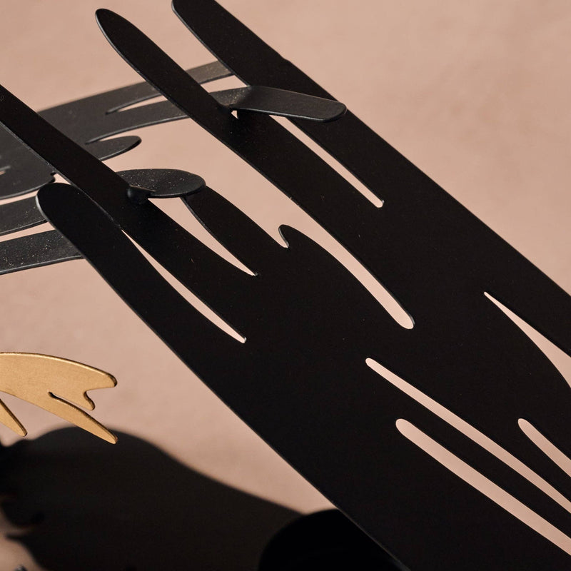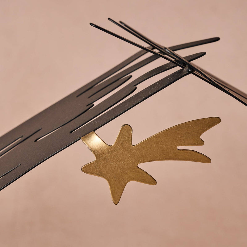 Bring the story of Christmas to life with this striking creche. Expertly crafted from a single piece of iron, this silhouette-style scene is a modern take on a timeless tradition. The stable structure is formed by bending the sides and roof at clean angles, with overlapping points soldered for strength and elegance. Figures of the Holy Family, wise men and animals are intricately cut and bent outward, creating a dimensional tableau. A radiant gold star shines above, while the Holy Family is highlighted in a golden finish creating a beautiful contrast to the creche’s matte black backdrop. A bold yet reverent piece, perfect for minimalist holiday décor. A Ten Thousand Villages Exclusive handcrafted in India. Materials: Iron with Powder Coating and Gold Shed - Measures: 9"L x 4.75"W x 7.5"H - Colors: Black, Gold - Handcrafted in India
